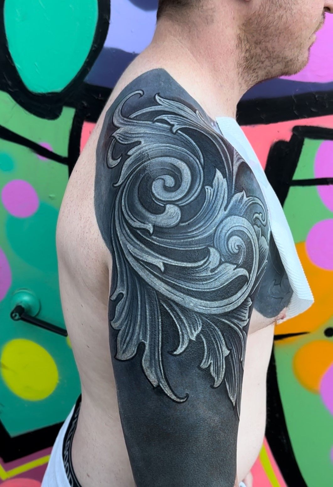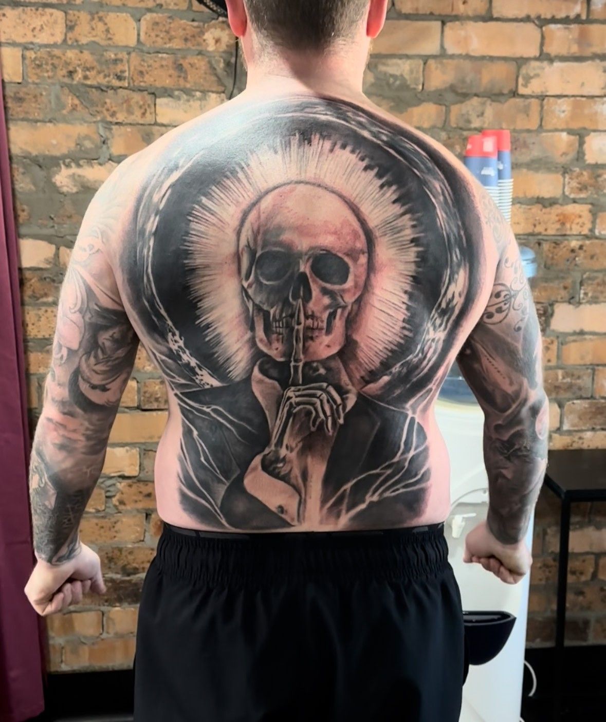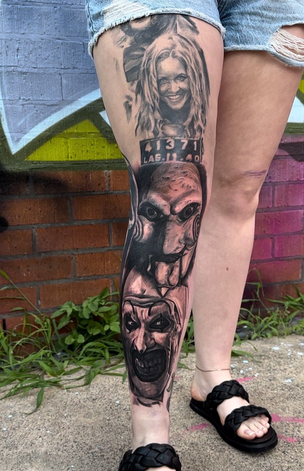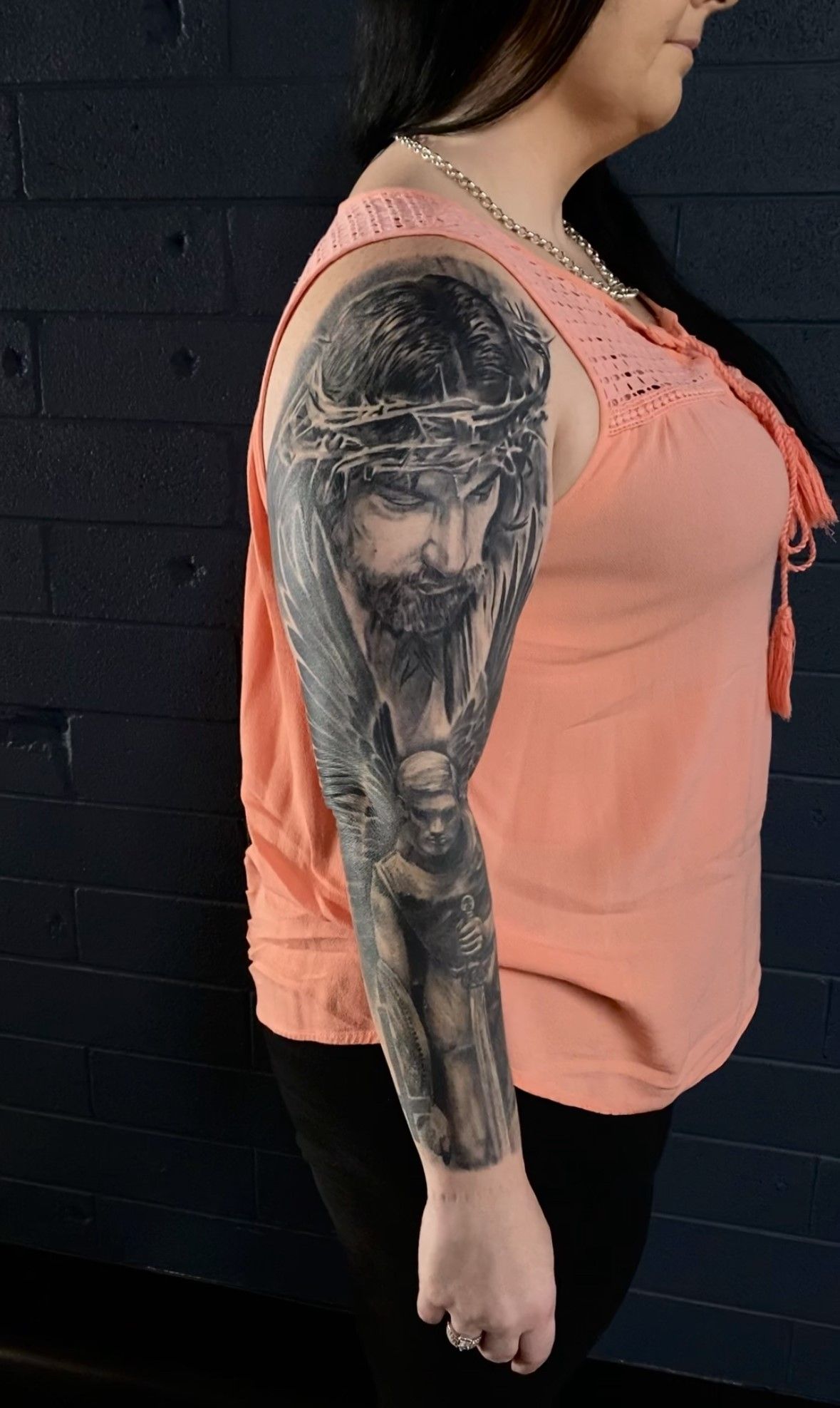 He loves all styles of tattooing especially the ones that challenge him. If he were to pick a preferred style it would have to be black and grey styles.